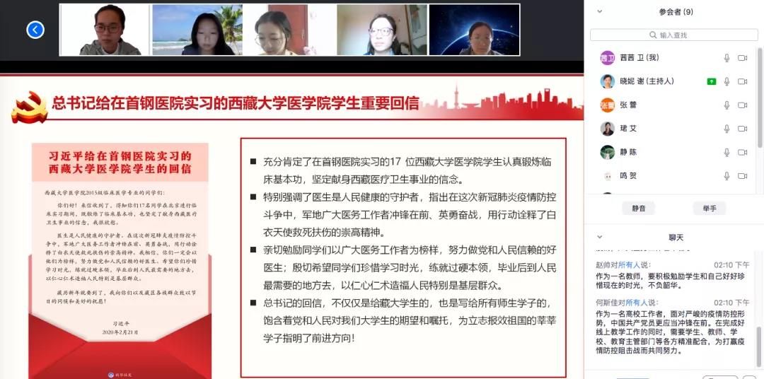 各教工党支部利用网络平台,以线上视频会议形式深入学习《回信》精神,在组织集体学习,督促个人学习的同时,鼓励教师通过班会时间积极组织学生集体进行学习。通过教师个人的学习与教师分享学生进行集体学习,每位老师都在支部微信群里发表了自己的学习感想。同时也有教师将学生的学习感想在微信群里与其他老师分享。本次学习引起大家积极的响应,每位教师都表达了将持续学习习近平总书记重要回信精神,并将回信精神与习近平新时代中国特色社会主义思想紧密结合,共同学习,深入理解习近平关于教育的重要论述。