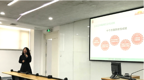 张乐芳助理为学生带来了题为《中共十九大的主题、主要成果和重要意义》的专题课程,以《领航》的视频为导入,进而以抢答的形式向学生介绍了十九大的召开时间、会议议程、会议主题等概况知识,激发学生兴趣。然后以十九大报告所总结的新时代、新思想、新矛盾、新目标,从一个全‘新’的角度与同学们一起探讨这次举世瞩目的盛会。最后,张助理对同学们提出了殷切期望,指出,青年一代是民族的希望和未来,青年兴则国家兴,要想顺利完成或者超前完成目标,需要我们在座的每一位青年为之努力奋斗。