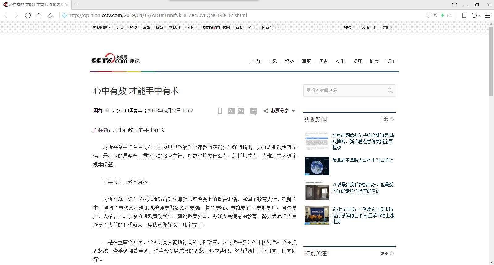 (图二)央视网转载beat365正版唯一官网必一党委书记于孟晨同志在《中国青年报》发表《心中有数 才能手中有术》文章截图