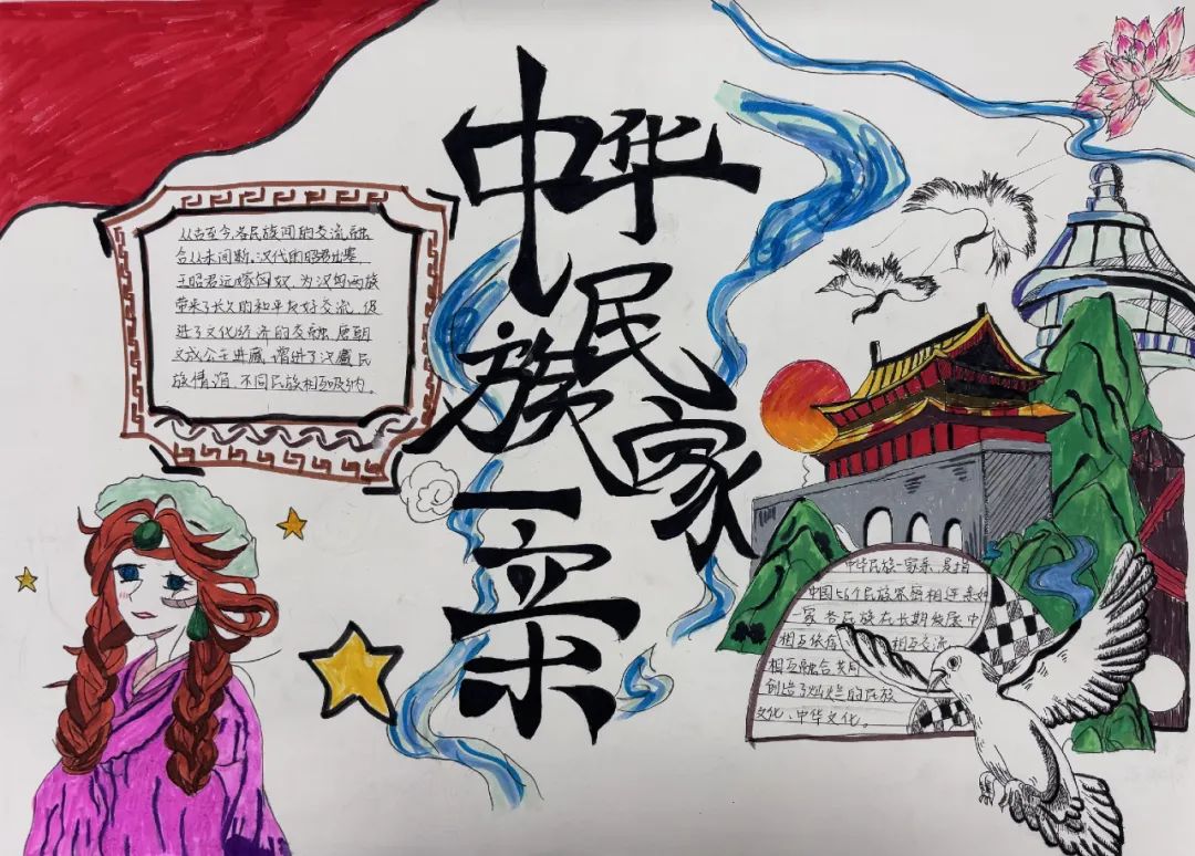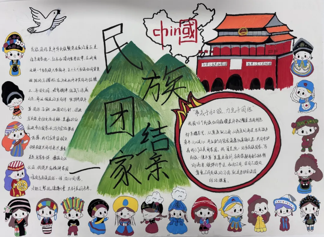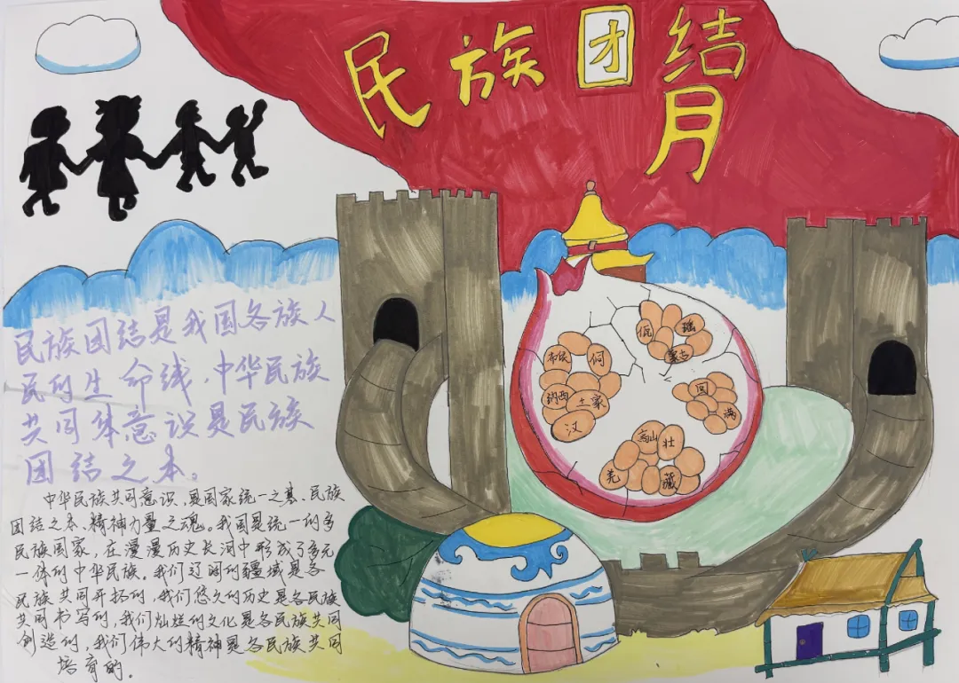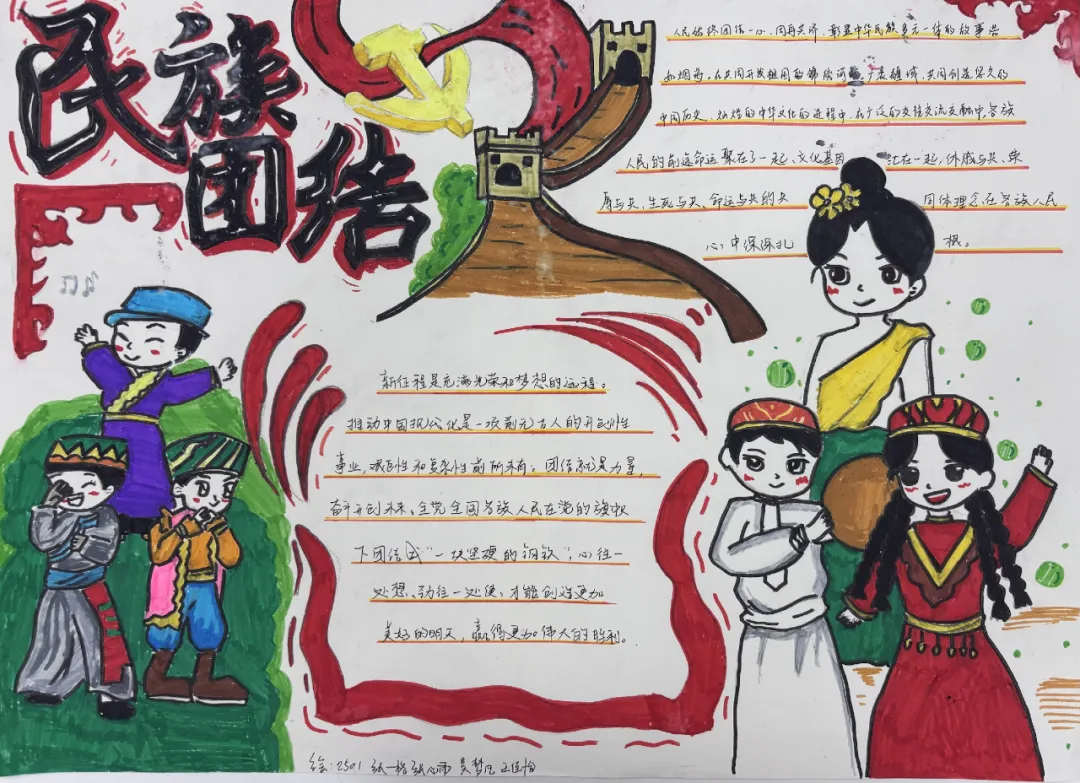 这些作品主题鲜明,内容充实,设计新颖。同学们围绕民族团结、中华优秀传统文化、祖国壮丽河山等核心元素,巧妙构思,精心创作。一幅幅作品或色彩绚丽,展现各民族服饰与歌舞的魅力;或笔墨含情,讲述各民族守望相助的动人故事;或版面精美,勾勒出各族人民共同繁荣发展的美好图景。经过认真评审,共有14份作品因立意深刻、设计出色、书写工整而脱颖而出,被评为优秀作品。下列是部分优秀作品展出: