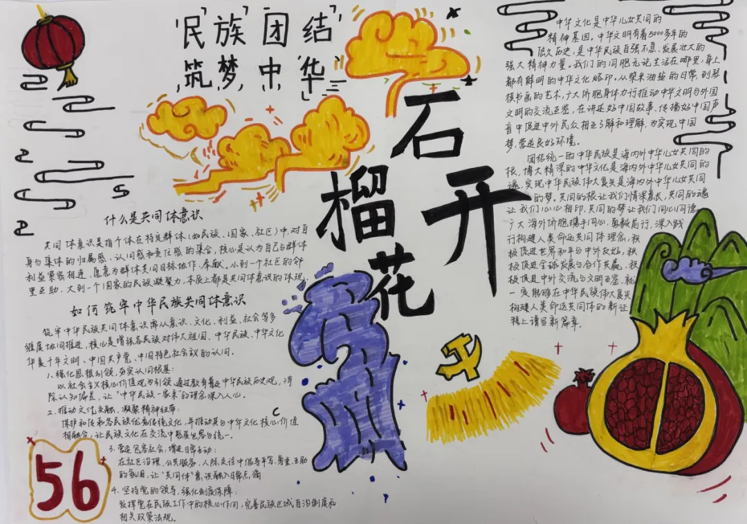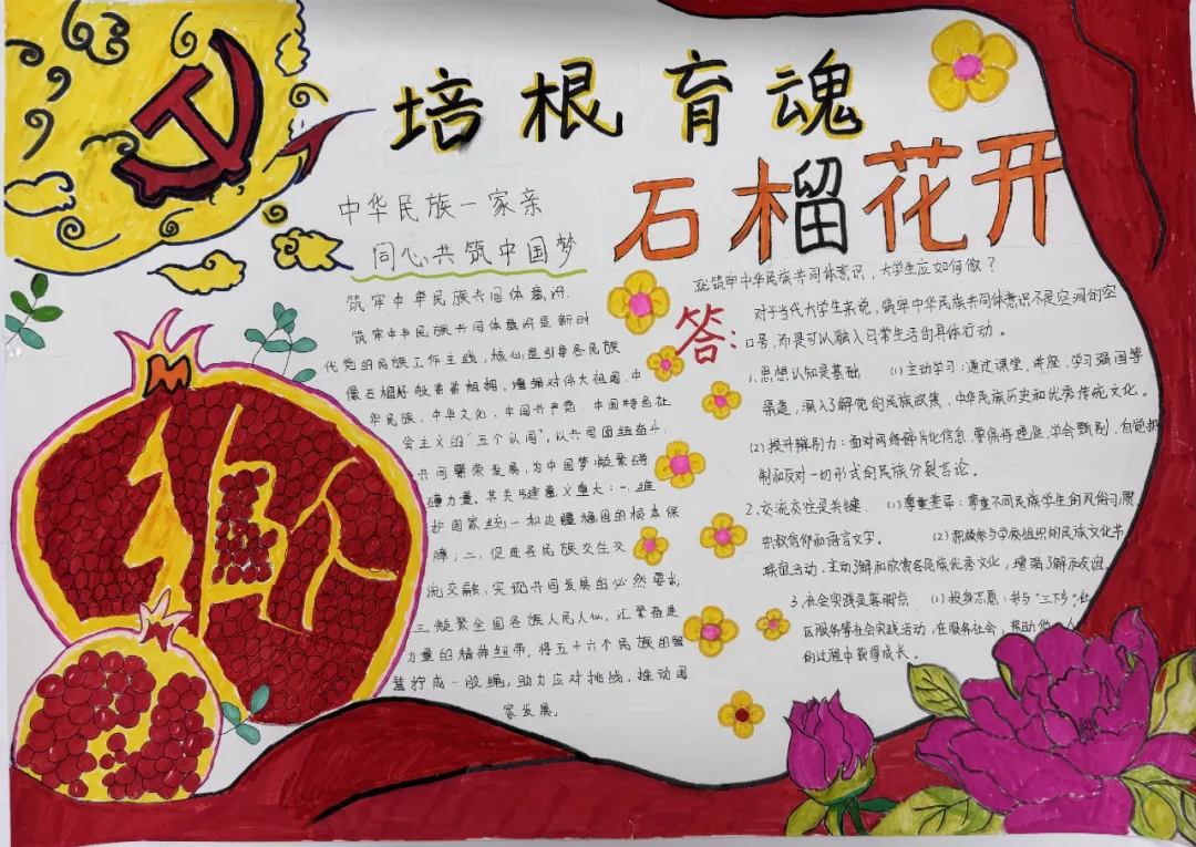 为深入贯彻落实学校关于民族团结进步教育的工作要求,深化爱国主义和民族团结教育,近日,beat365正版唯一官网必一第二青年社区分党委成功举办了民族团结月主题手抄报征集活动。本次活动以生动活泼的艺术形式,在学生中营造了“培根育魂 石榴花开”的浓厚氛围,取得了良好的育人效果。