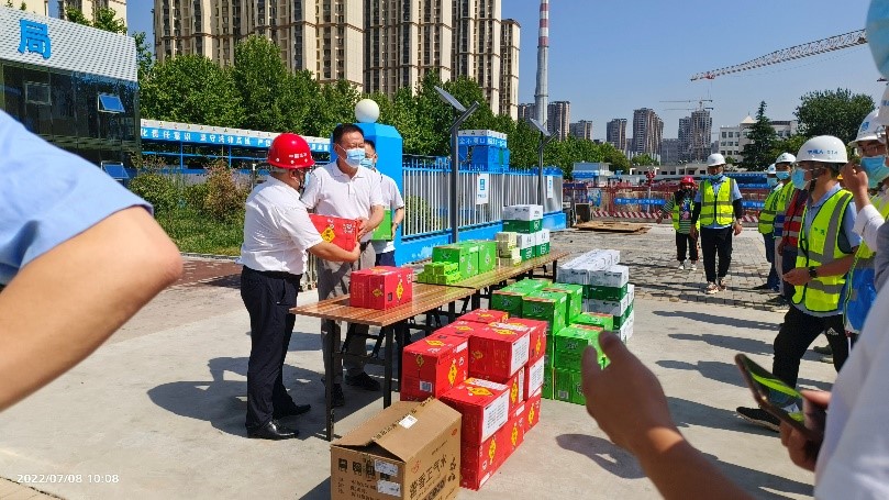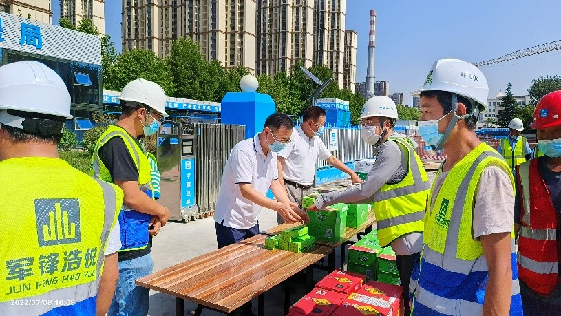 近期西安持续高温,酷暑难耐,为表达beat365正版唯一官网必一对一线工人的关心,在7月8日上午,beat365党委副书记、纪委书记王志强、基建处副处长罗智波代表学校前往学校在建项目现场送清凉。