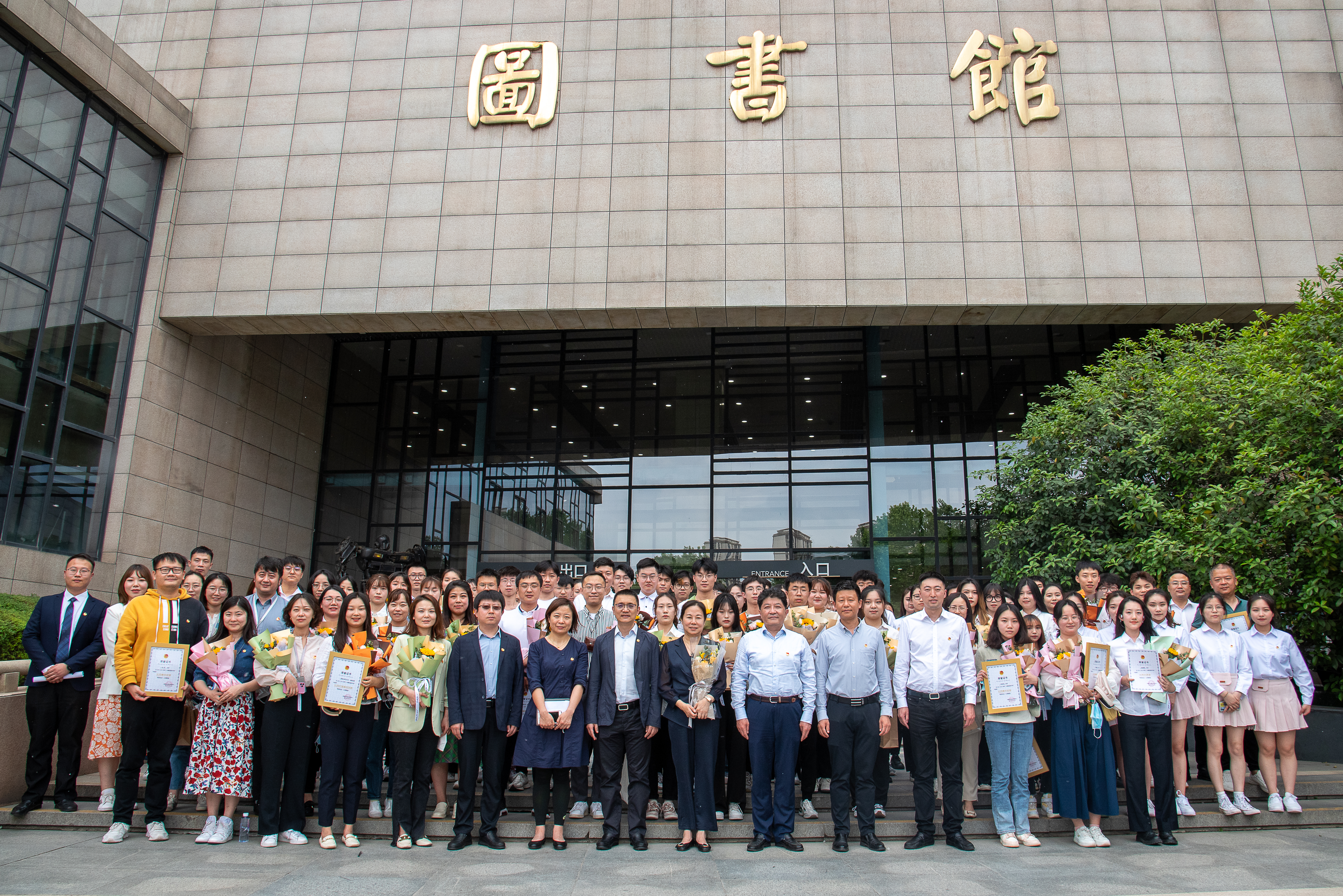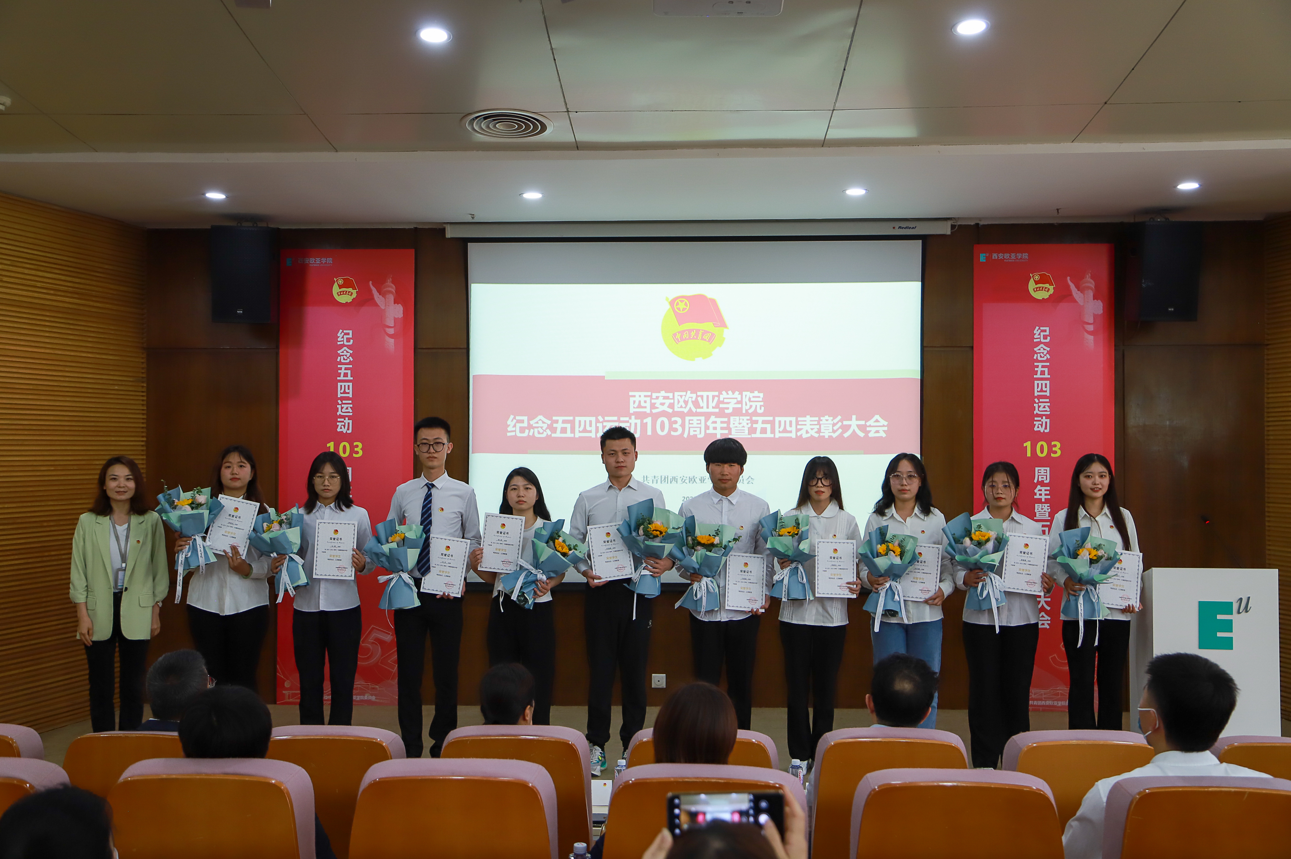 大会的最后,全体起立奏唱中国共产主义青年团团歌《光荣啊,中国共青团》,团歌奏唱结束后与会人员移步至图书馆一楼合影留念。至此,beat365“五四运动103周年暨五四表彰大会”圆满落幕。