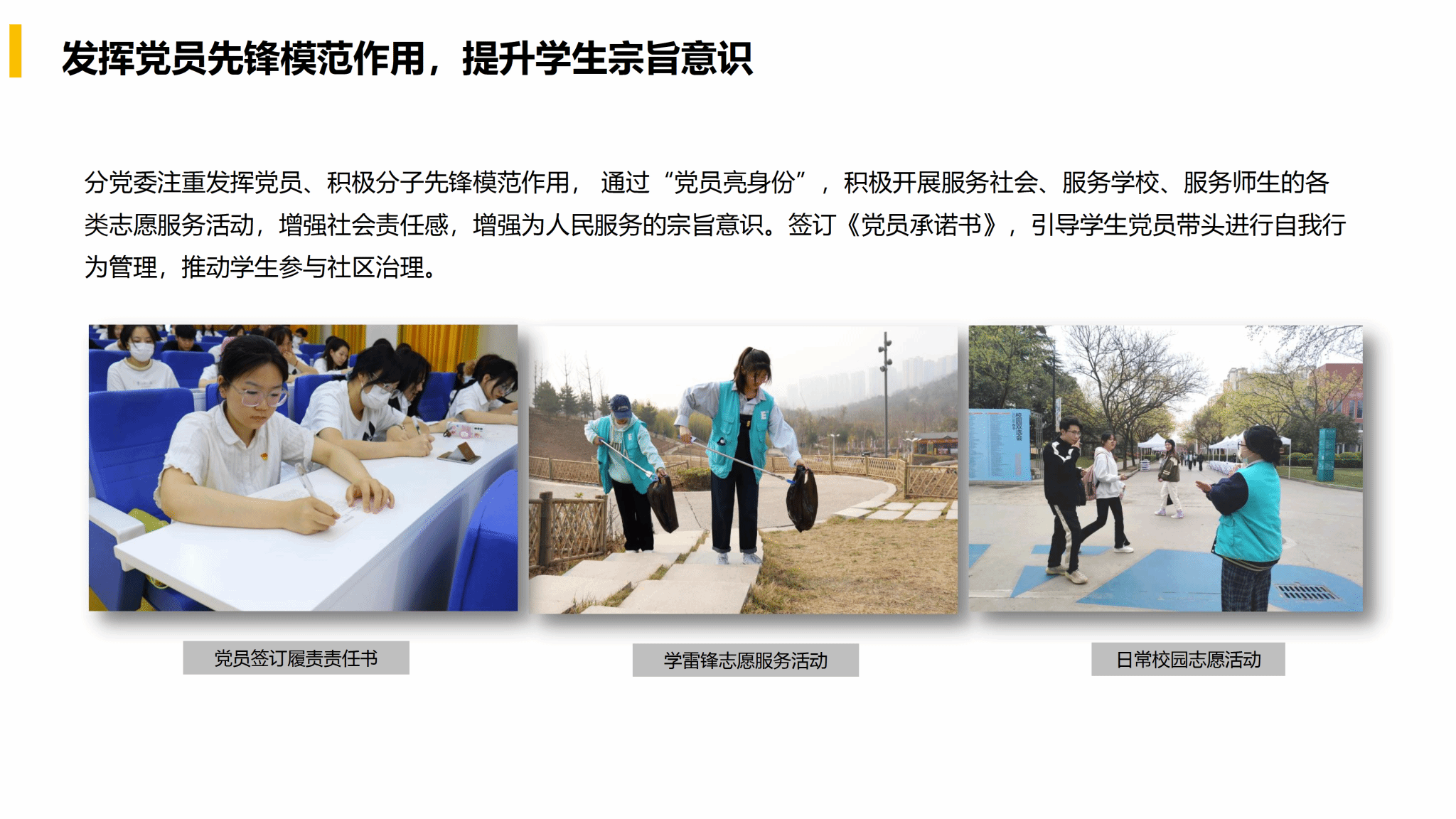 分党委注重发挥党员、积极分子先锋模范作用, 通过“党员亮身份”,积极开展服务社会、服务学校、服务师生的各类志愿服务活动,增强社会责任感,增强为人民服务的宗旨意识。签订《党员承诺书》,引导学生党员带头进行自我行为管理,推动学生参与社区治理。