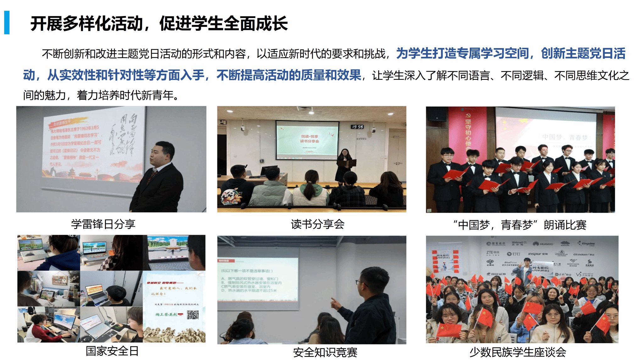 不断创新和改进主题党日活动的形式和内容,以适应新时代的要求和挑战,为学生打造专属学习空间,创新主题党日活动,从实效性和针对性等方面入手,不断提高活动的质量和效果,让学生深入了解不同语言、不同逻辑、不同思维文化之间的魅力,着力培养时代新青年。