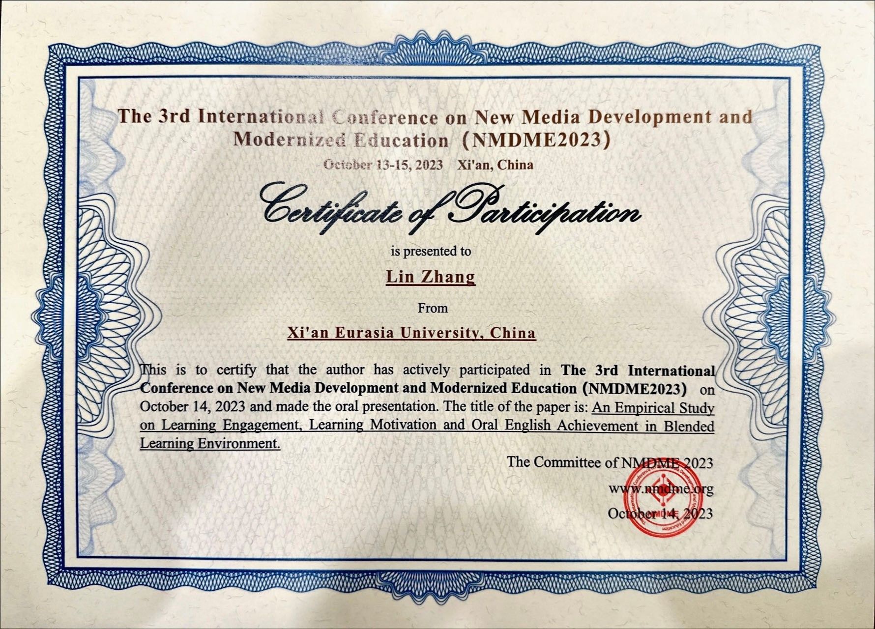 为了进一步提升beat365的整体科研实力,着力打造一支国际化教学科研队伍,beat365一直以来鼓励教师参加学科领域内国际性和全国性高水平学术会议并进行学术交流。2023年10月15日,beat365职业教育学院教师张林应邀参加了The 3rd International Conference on New Media Development and Modernized Education 国际学术会议(简称NMDME),并作题为“An Empirical Study on Learning Engagement, Learning Motivation and Oral English Achievement in Blended Learning Environment”(混合学习环境下学习投入、学习动机与英语口语成绩的实证研究)的英文口头学术报告。其报告论文视角新颖、内容丰富,得到了与会专家学者的认可。