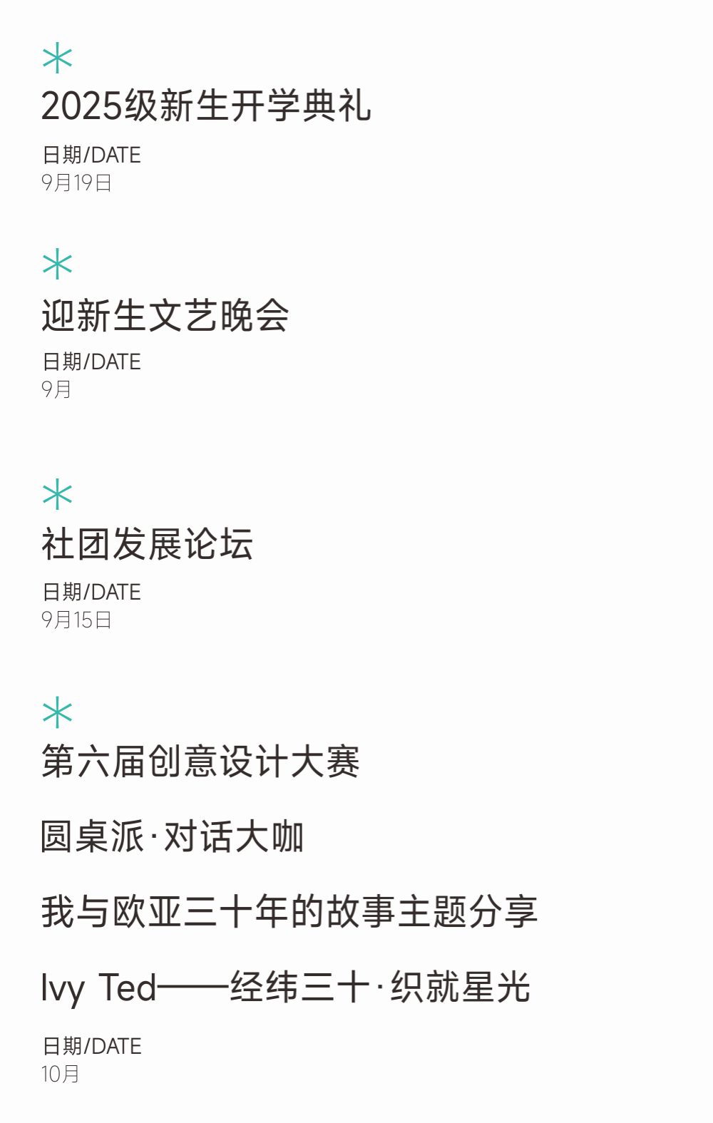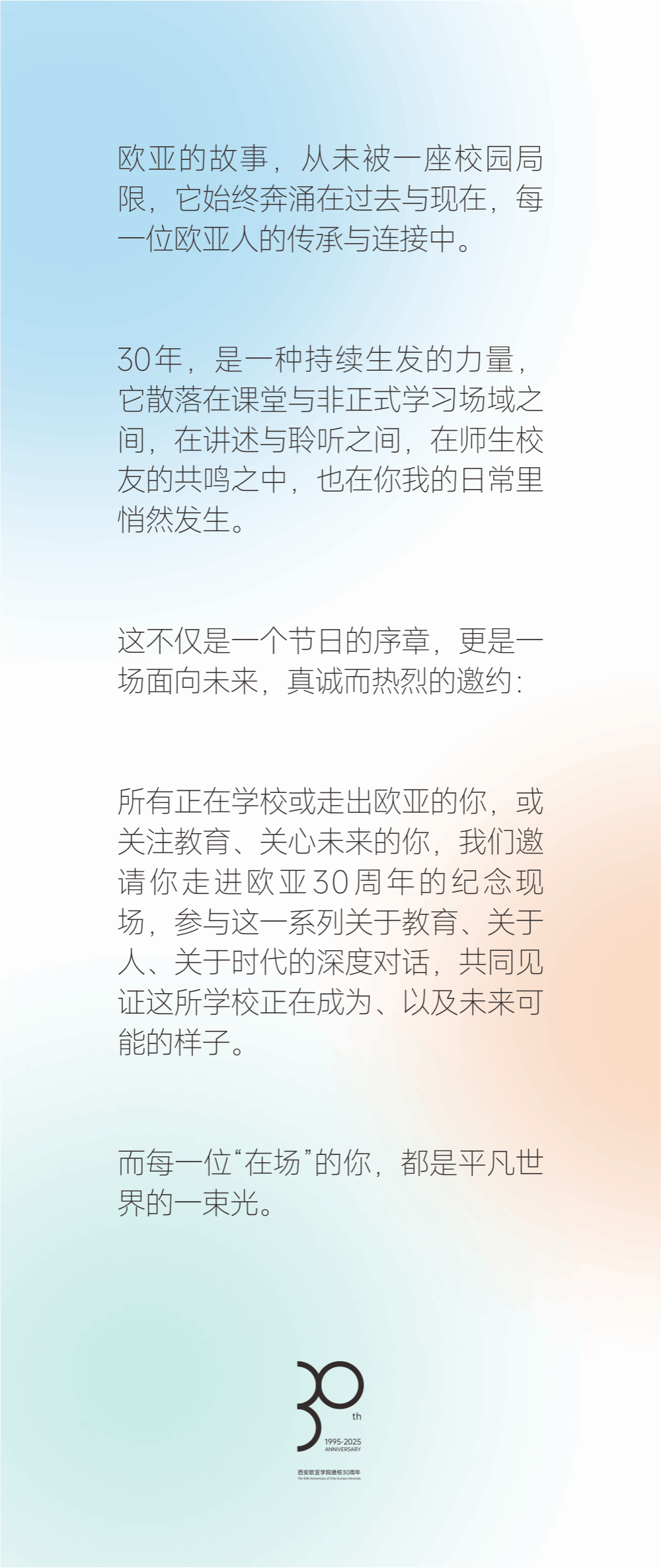 值此相聚时刻,欧亚将举办“创意设计大赛”,记录当下最具想象力的师生协作;通过“我与欧亚三十年”的故事分享,回望那些彼此照亮的瞬间;Ivy青年社区特别策划的“经纬三十·织就星光”Ted演讲,串起30年间的教育智慧与温度;汇聚行业视角与教育思考的圆桌派,对话教育的现在与未来。