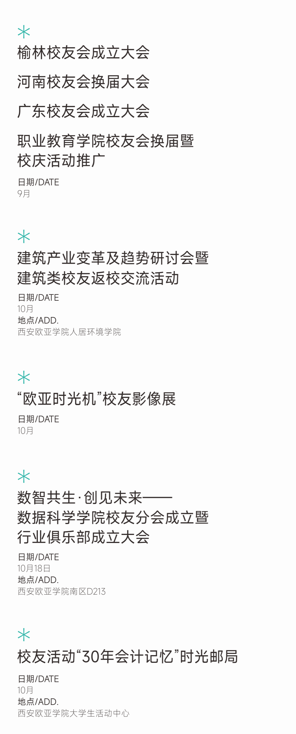 “时光机影像展”收集校友们的老照片与视频,串起欧亚30年的青春剪影。"30年会计记忆"时光邮局,一场跨越岁月的重逢仪式,和过去的你打个照面。汇聚力量,开启系列校友返校交流活动,让充满活力的校友彼此分享、相互激发,这不仅是一次次探索的成果展示,更是欧亚式成长在社会中的真实回响。