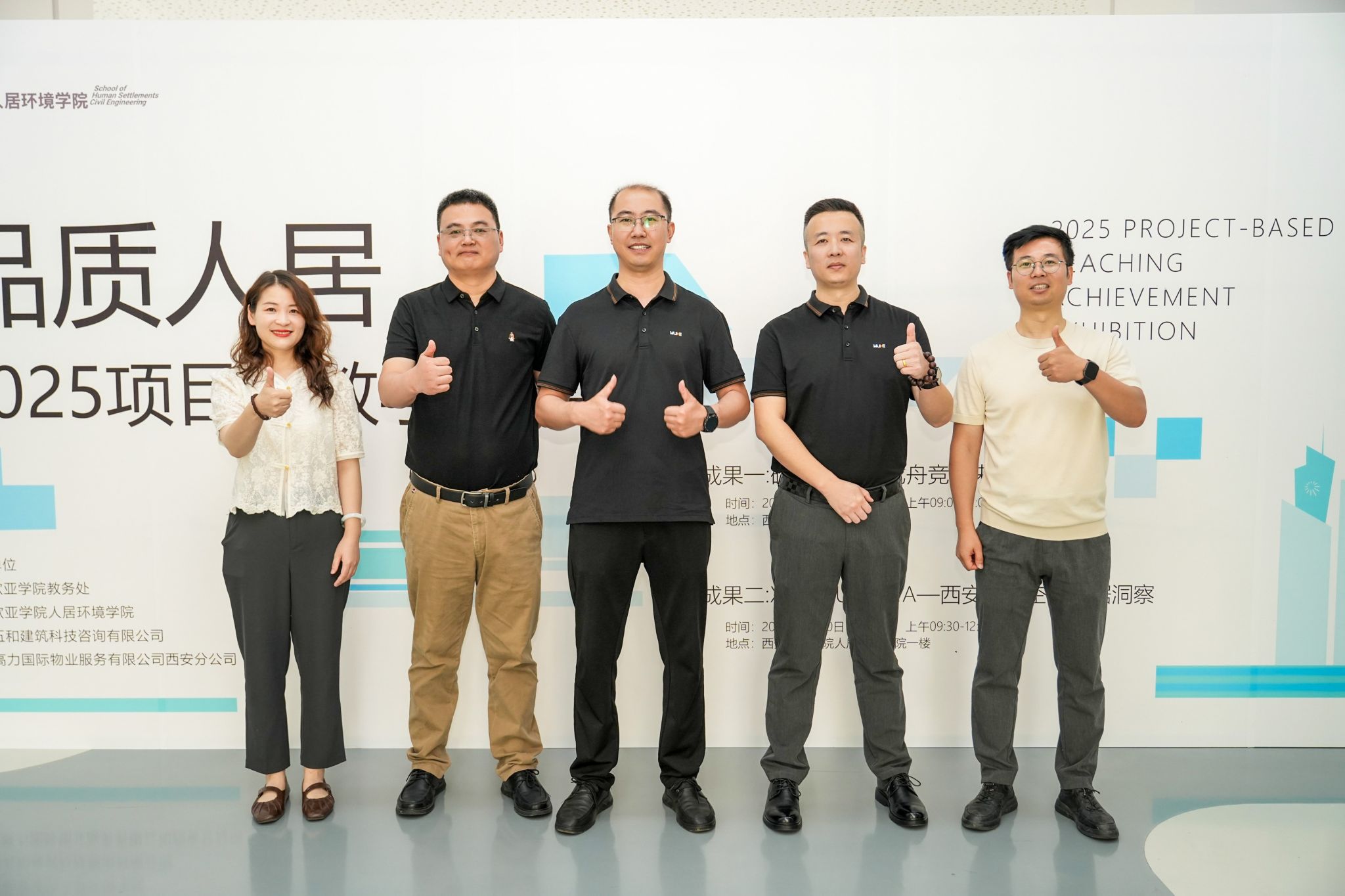 西安建筑科技大学土木工程学院张阳玺副教授(右一)、西安五和建筑科技咨询有限公司总经理景武斌(右三)、西安五和新材料科技集团有限公司分公司总经理朱常平(右五)作为项目导师进行指导。企业嘉宾一行人来到现场祝贺开幕。