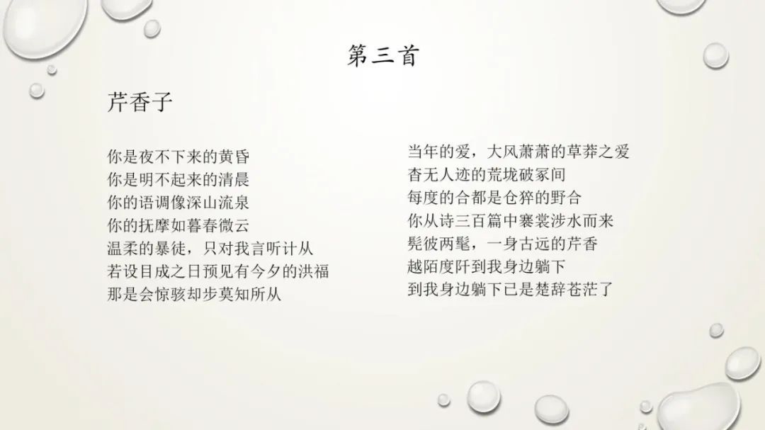 《芹香子》是一首商籁体的情诗,但既不是莎士比亚式的商籁格式(4+4+4=2),也不同于佩脱拉克式的商籁格式(8+6),而是以前后各七行(7+7)的对照形成独特的韵律。童明认为,木心的十四行诗,虽然不严格押韵,却注重内在的节奏律动。诗中“我”大概是女性。对比《诗经》中“淑女”和“子都”(美男子)之间的情话,木心的“芹香子”是个新的称谓,取其朴实和清新。