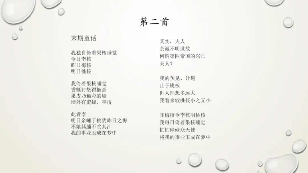 《末期童话》则以“果核”为核心意象,构建了一个“比果核更小”的微型世界:“果皮乃釉彩的墙,墙外有蜜蜂”,诗人每日在梅核、李核、桃核间切换居所,在梦中“玉成”其“事业”。童明阐释道,这一意象可比照斯威夫特《格列佛游记》的小人国,以夸张的比例营造奇幻感,同时暗合莎士比亚《哈姆雷特》中“困于果核,仍是宇宙之王”的哲思。不过,此诗中的“我”并无哈姆雷特式的焦虑;他轻声道出“宇宙”二字,可以看出他由里向外的自在,通透着自里向外的宇宙观。
