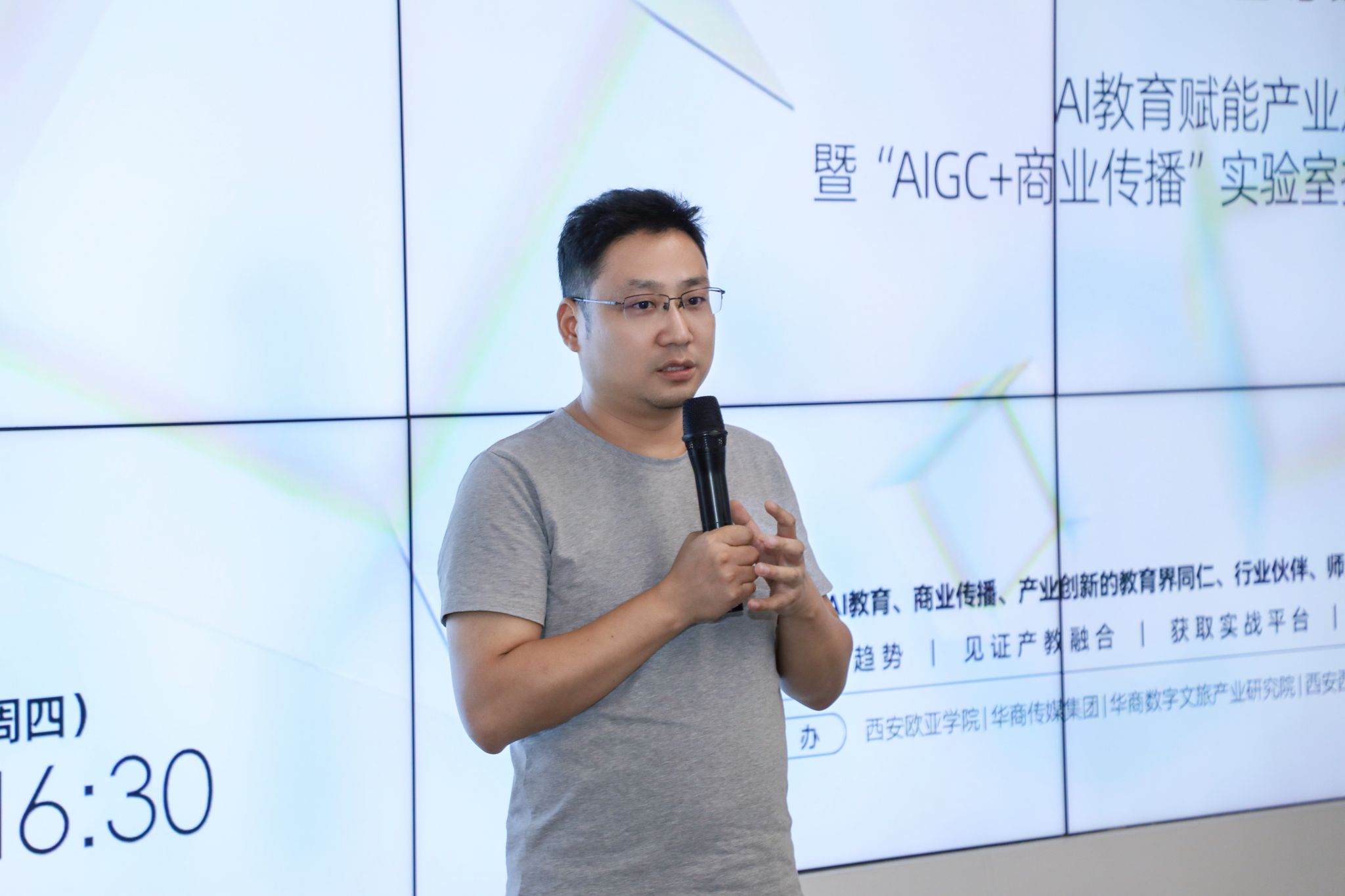华商传媒集团总裁助理刘晓斌现场讲解产品,并介绍基于AI大模型下“AI舆情”产出案例,他提出“AI技术正在改变内容生产与传播方式,我们希望与高校共同探索AI在商业传播中的应用,培养适应未来行业需求的人才。”