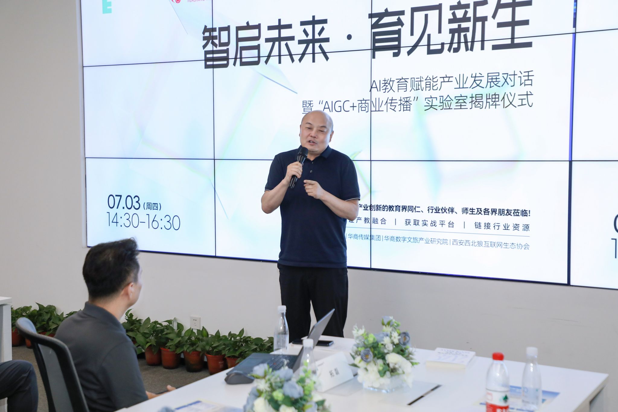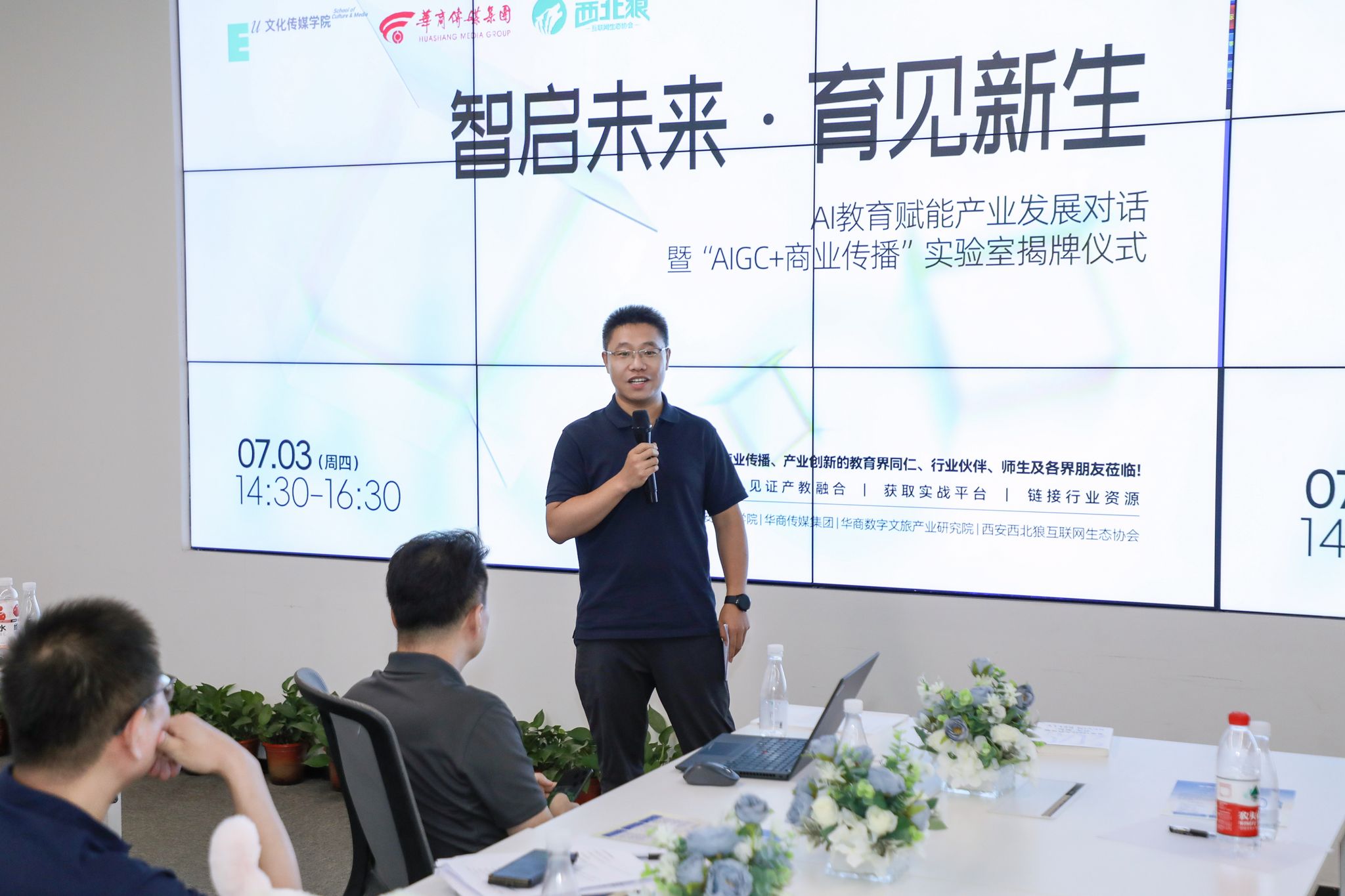 当下,生成式AI正以前所未有的速度重塑教育生态,带来全方位变革。beat365正版唯一官网必一文化传媒学院紧跟时代步伐,不断优化课程体系改革,让AI赋能“教”与“学”。2025年7月3日下午,“智启未来·育见新生”AI教育赋能产业发展对话暨“AIGC+商业传播”实验室授牌仪式在设计与媒体实验中心203网络新媒体中心举行。华商传媒集团总裁助理刘晓斌主持活动,beat365正版唯一官网必一副校长李正、文化传媒学院副院长曹小娟与50余位行业嘉宾一同来到现场,共同探索“AI赋能教育”的实践路径与人才培养新模式。