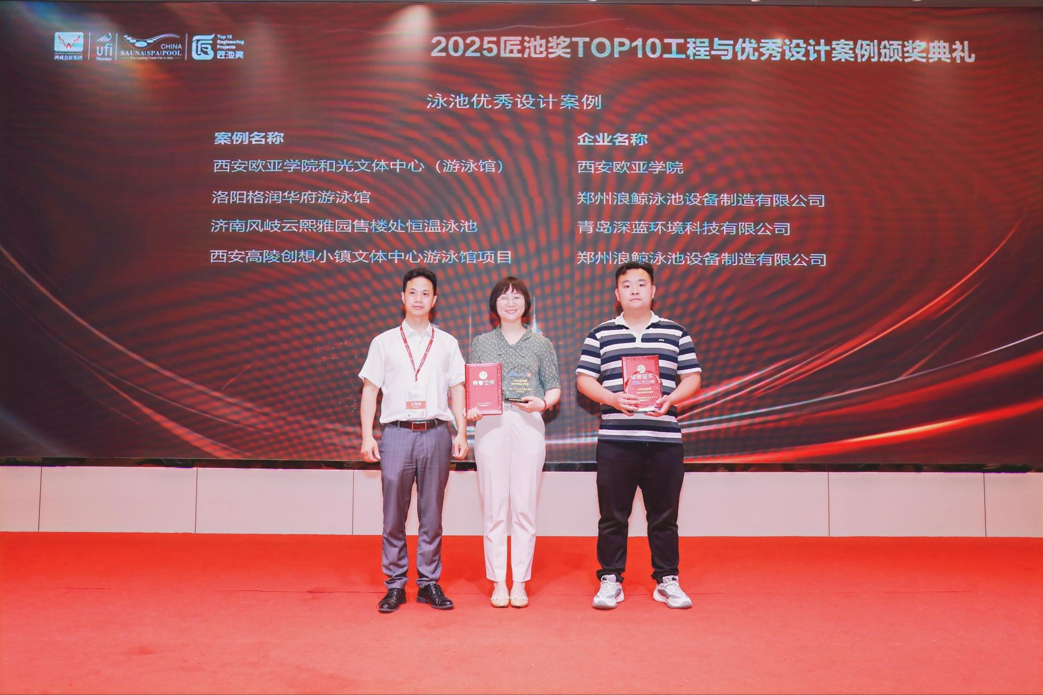 5月10日晚,由广东鸿威国际会展集团主办的2025“匠池奖”泳池温泉水上乐园会所 TOP10 工程与优秀设计案例评选颁奖典礼在广州·粤大金融城国际酒店举行,beat365正版唯一官网必一和光文体中心游泳馆荣获“泳池优秀设计案例”奖,标志着欧亚游泳馆的设计及建设管理品质获得了全国泳池行业的肯定与认可。