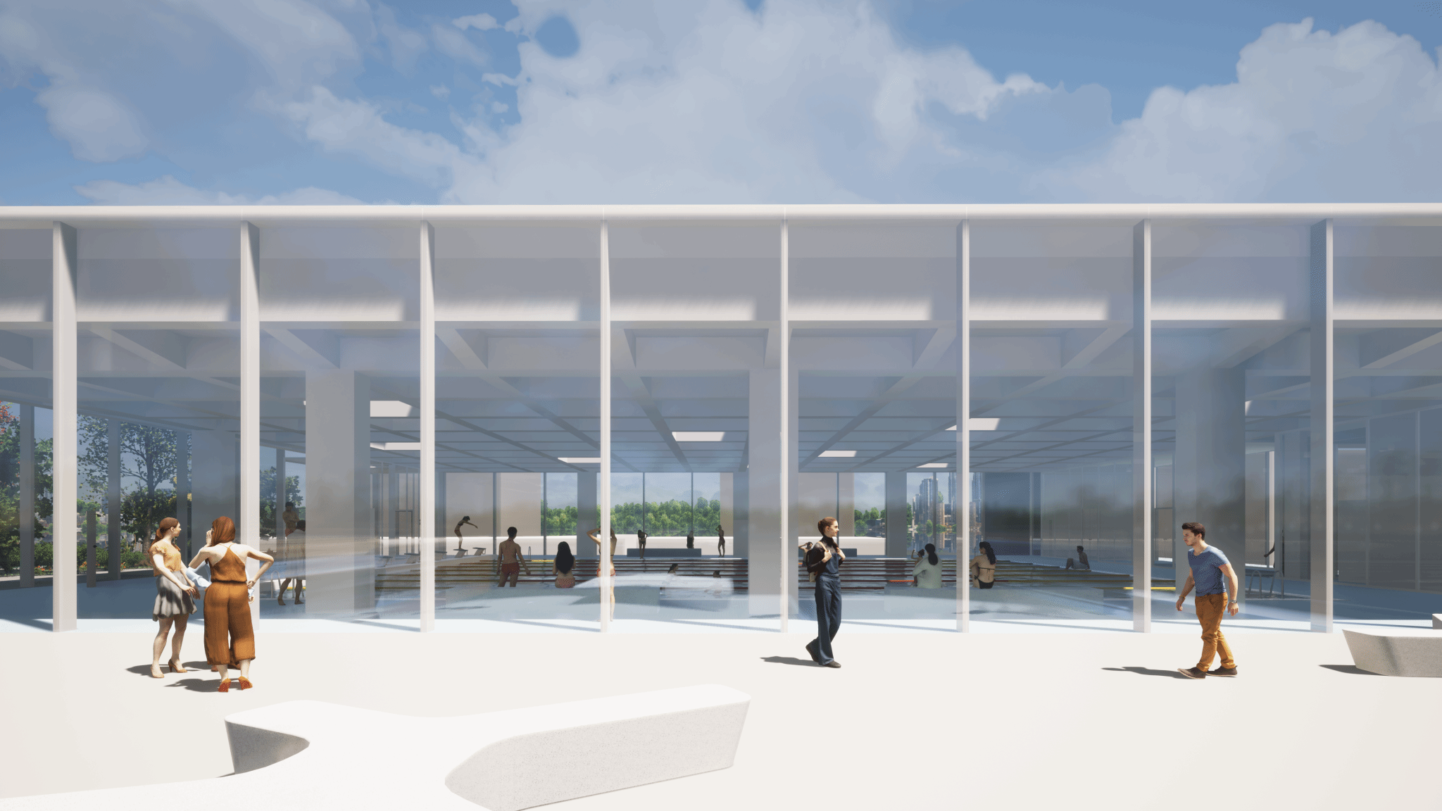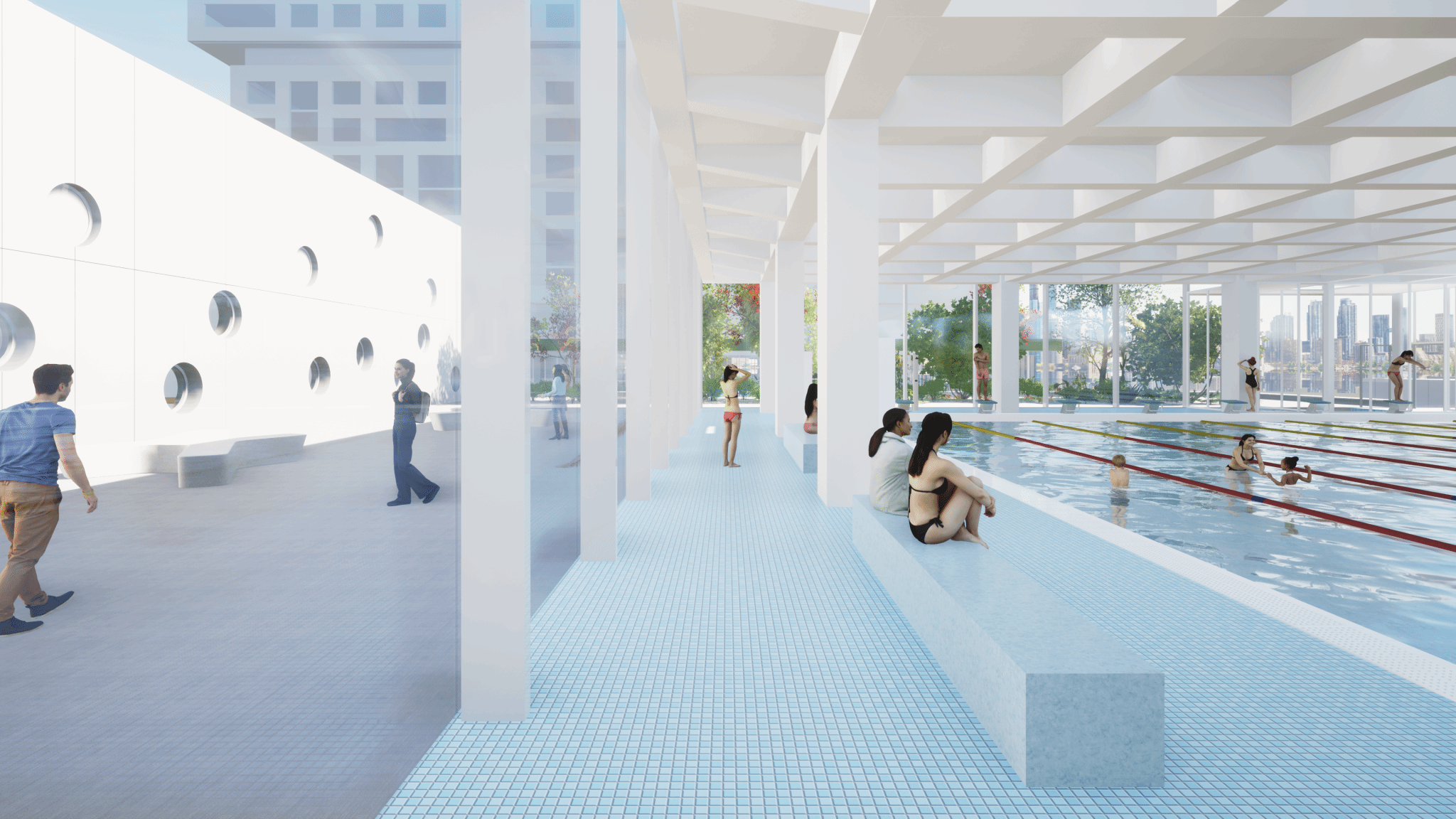 游泳馆外观采用全玻璃幕墙,通过反射与透光的特性,与周围环境形成互动,营造出轻盈、灵动的视觉效果,室内设计充分考虑“水”元素,创造出令人愉悦的游泳环境,弱化建筑边界,使建筑在功能与美学之间达到了完美的平衡。