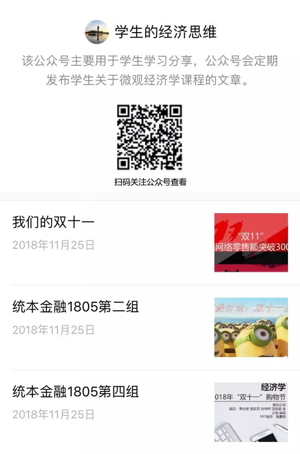 为了丰富学生学习体验感,课程设立了属于学生的公众号——“学生的经济思维”,作为学生作品的发布平台,让他们看到自己的作品通过公众号加以传播,激发他们优化作品,提升思考层次与参与分享的积极性,再通过他们自己的分享,让更多的人了解他们在经济学课堂中的学习成效。