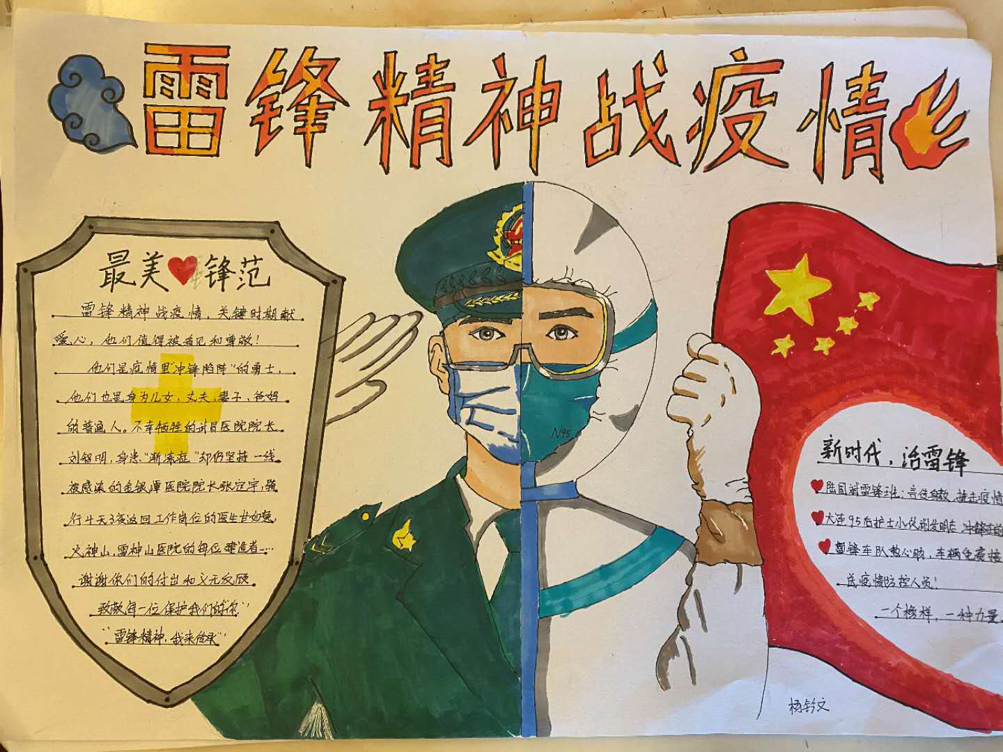 此次活动征集的手抄报内容丰富、图文并茂、标新立异、主题突出,每位作者都将雷锋精神与发生在疫情防控前线的英雄事迹完美结合,并向大家介绍了疫情防控的“预防小贴士”,同时也向奋战在一线的最美“逆行者”表达敬意。