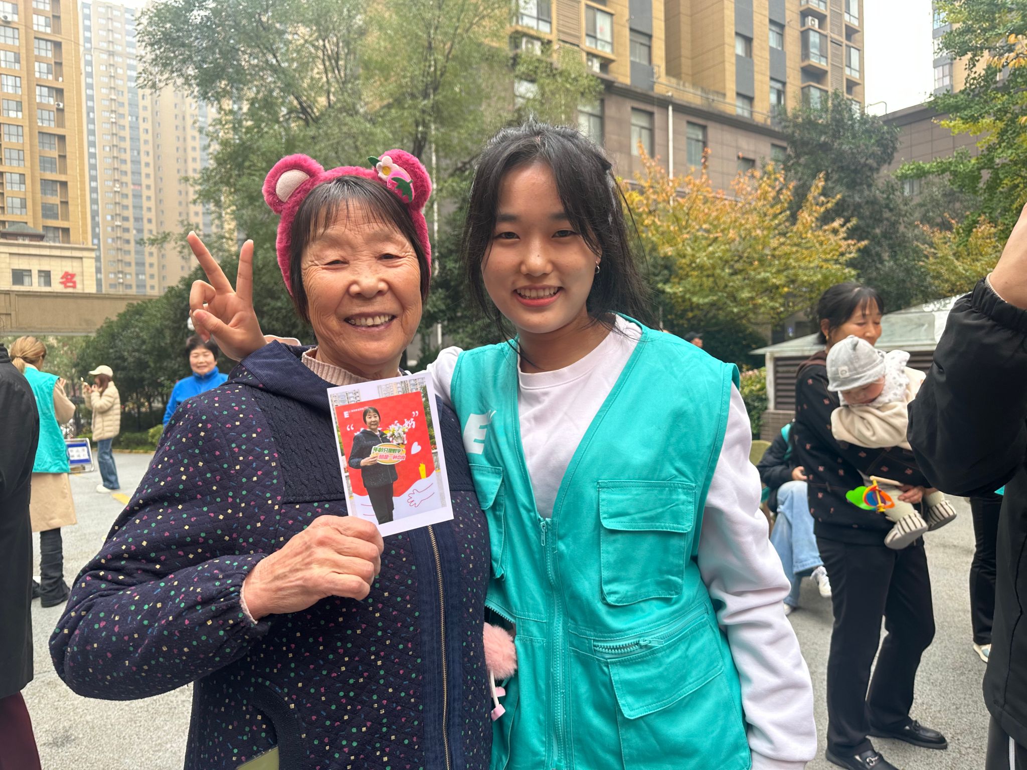 潮拍刚结束,更让人惊喜的环节来啦!志愿者们早就备好打印机,照片 “唰唰” 输出,刚拍好的 “时尚大片” 转眼就到手!爷爷奶奶捧着新鲜出炉的照片,有的仔细端详自己的酷范儿 pose,有的和身边人分享 “你这张拍得比我还潮”,指尖轻轻摩挲着照片,眼里满是藏不住的欢喜 —— 毕竟刚拍完就能拿到专属酷照,这份 “即时快乐”,谁能不心动?