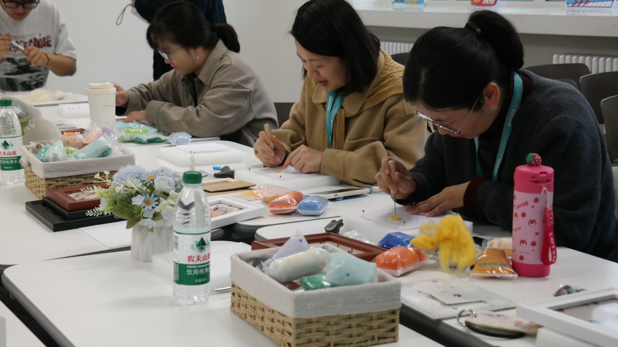 在这样轻松的氛围里,师生们渐渐放下拘谨。有的同学为了做出立体的小花朵,主动向身边擅长手工的老师请教;有的老师则和学生组队,一人负责勾勒轮廓,一人负责填充细节,原本需要独自完成的作品,在协作中变得更具创意。指尖的动作从生涩到流畅,羊毛在一次次戳压中逐渐成型,过程中偶尔出现的小挑战,反而成了大家交流的契机——“这里要轻一点,不然会戳破底布”“我们可以加些浅色羊毛做渐变效果”,细碎的讨论声里,满是彼此支持的温暖。