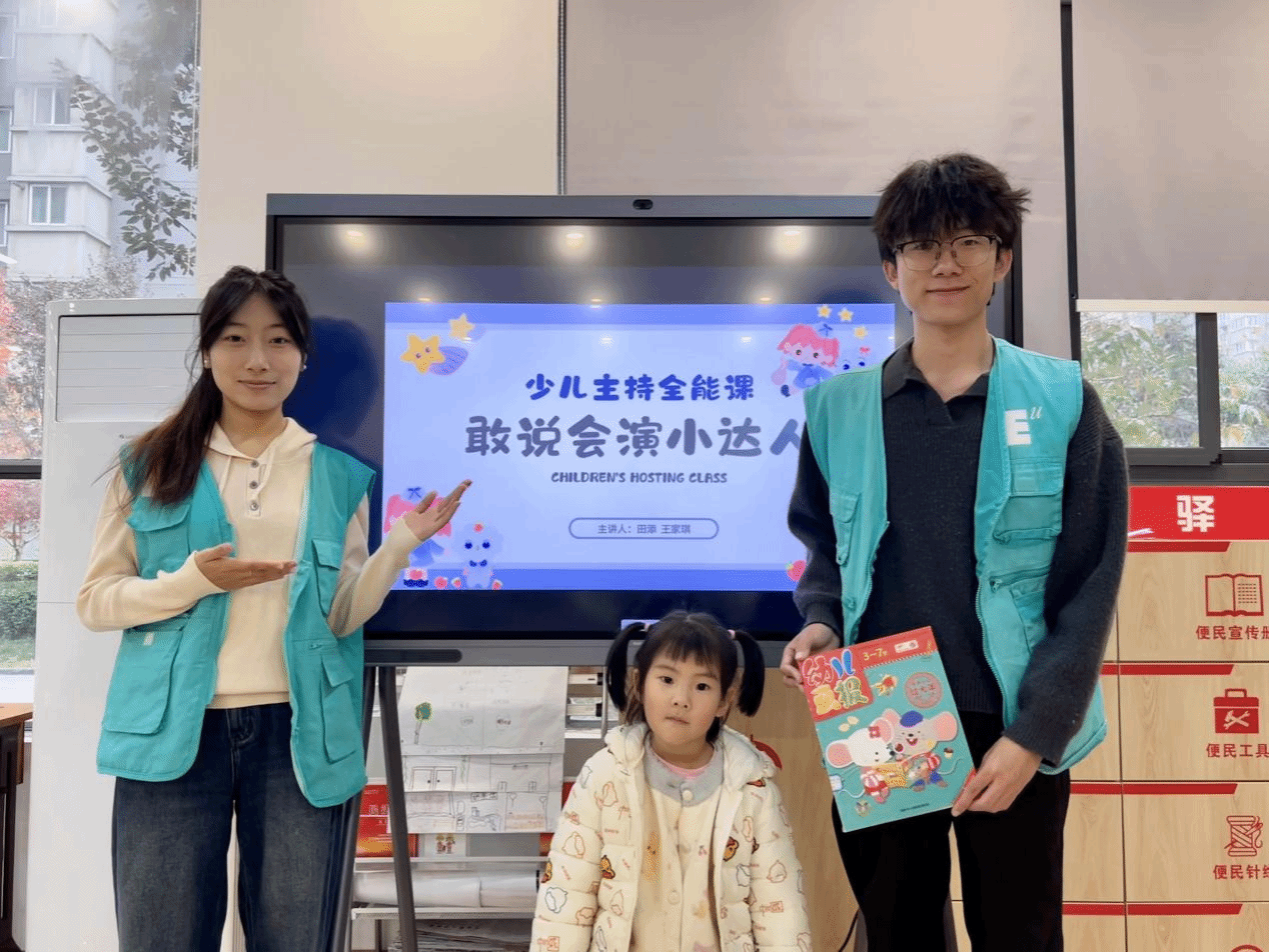 基础训练结束后,进入“小小舞台”环节,让小朋友们轮流登台模拟主持。志愿者从仪态到语调都进行一对一指导,用实际行动诠释“大手拉小手”的温暖陪伴。随后的朗诵环节中,小朋友们仍旧热情不减,用稚嫩而饱满的声音生动演绎《春天来了》《如果我是一片雪花》等篇目,将学习到的知识充分应用。