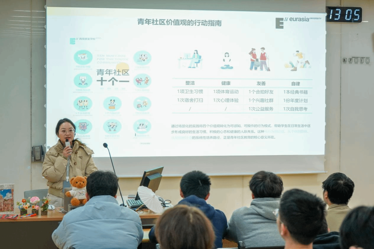 陈满晨老师以一段精心制作的视频自然开场,将同学们带入“无限·成长”的主题氛围,并进一步串联起Ivy青年社区“无界”文化,使理念更易被理解和接纳。她重点讲解了“第二课堂”的重要性,通过真实案例展示只要主动参与、合理规划,积累学分并不困难,并指出第二课堂成绩在奖学金、评优评先中的决定性作用。在校规校纪部分,她以严肃而必要的提醒,强调课堂纪律、宿舍卫生、夜不归宿等行为的红线,帮助同学们明确底线意识。面对大三学生的现实需求,她从考研、考公与就业三条路径提供时间线与策略建议,为处于选择十字路口的同学们提供清晰方向。她还对表现突出的同学进行表彰,以榜样力量激励更多成长。最后,她以“鲶鱼效应”为例,通过压力机制解析与调适技巧分享,帮助同学们提升自我管理能力。在互动交流中,大家分享学习诀窍、情绪管理经验,现场氛围温暖、有力量。