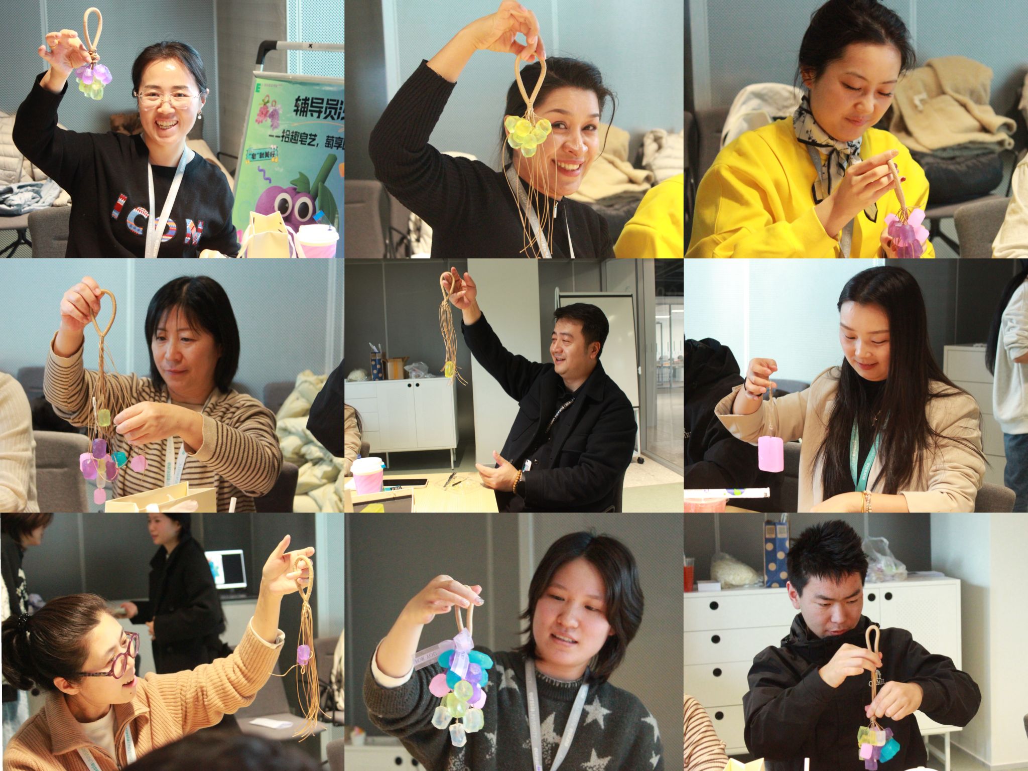葡萄皂静置定型后,一场小型 “作品展” 悄然上线:晶莹的串状葡萄皂、憨态的单颗款、绿叶点缀的创意品,每一件都藏着独一无二的巧思,正如欧亚 30 年来,每一位教育者在平凡岗位上书写的不凡育人故事。大家手持自己的 “得意之作” 合影,镜头里的笑脸明亮又真挚,这笑容里有手工创作的成就感,更有同行相伴的归属感 —— 而这份温暖,正是 “做平凡世界的一束光” 最鲜活的注脚。