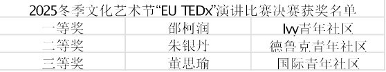 此次“EU TEDx”演讲比赛(决赛)的成功举办,不仅为同学们提供了一个展示自我、交流思想的平台,更让青年社区共享价值观在校园中凝聚共识。未来,Ivy青年社区将继续举办更多丰富多彩的活动,让社区充满活力与温暖,让每一位同学都能在社区中收获成长与快乐!