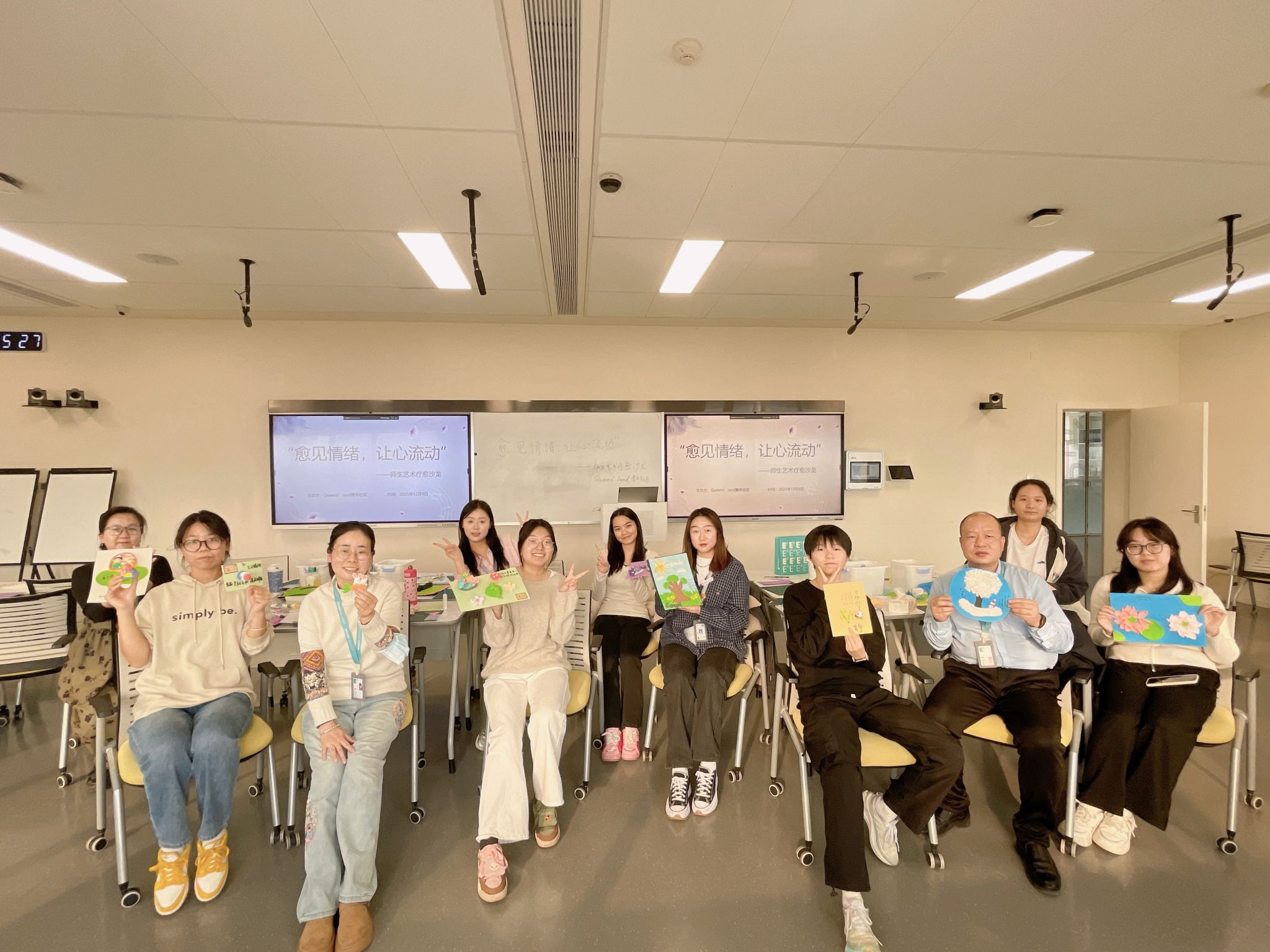 一块小小的黏土,不仅捏出了花草与萌物,更捏出了师生之间的默契与共情。有人说:“捏黏土就像和学生打交道,需要耐心调整,才能找到最合适的姿态”;有人感慨:“原来不用多说什么,一块黏土、一首小诗,就能读懂彼此的心意”。活动最后,大家捧着自己的作品合影留念。镜头里,一张张笑脸明媚灿烂,桌上的黏土作品错落摆放,每一件都是独一无二的情绪勋章,每一幕都是师生同行的温暖证明。