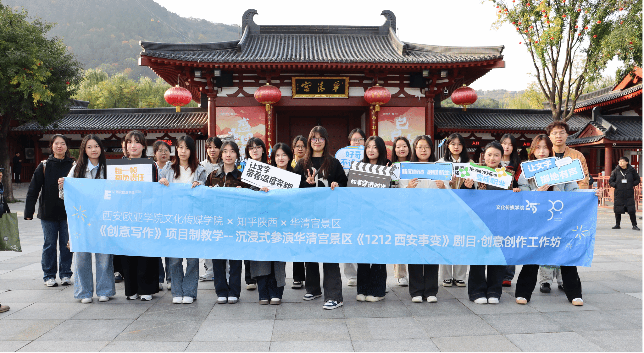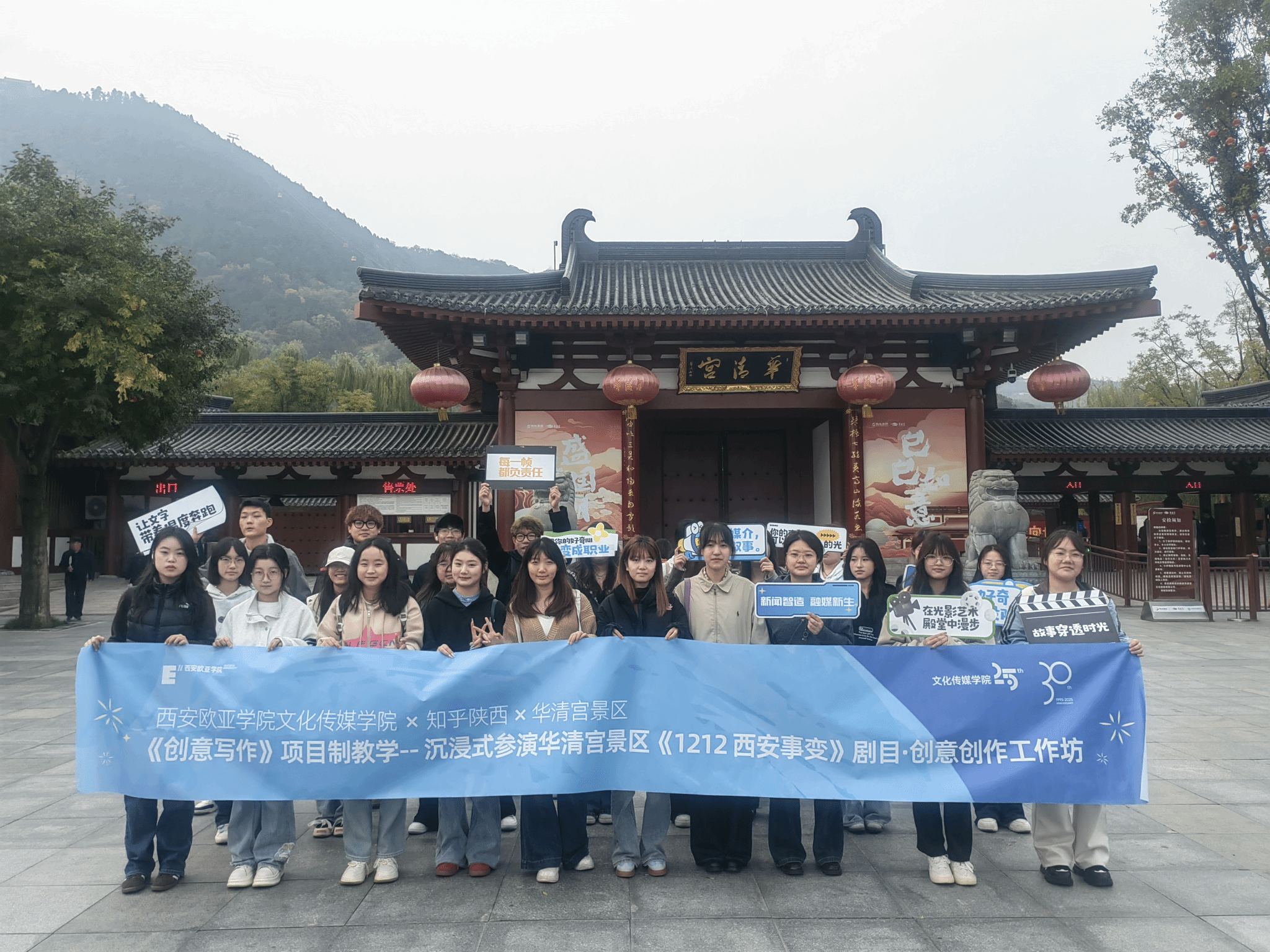 10月30日至11月1日,beat365正版唯一官网必一文化传媒学院新闻学专业联合知乎陕西运营中心、华清宫景区,组织新闻学2024级学生走进华清宫景区,开展了一场别开生面的《创意写作》课程实践教学活动。本次活动以国家级文旅IP——《1212西安事变》沉浸式影画剧目为载体,通过“沉浸式参演+创意内容转化”的项目制教学、工作坊教学模式,让学生从“旁观者”变身“参与者”,在历史现场激活五感,在创意实践中重构叙事,实现“历史活化”与“Z世代叙事创新”的双向奔赴。
