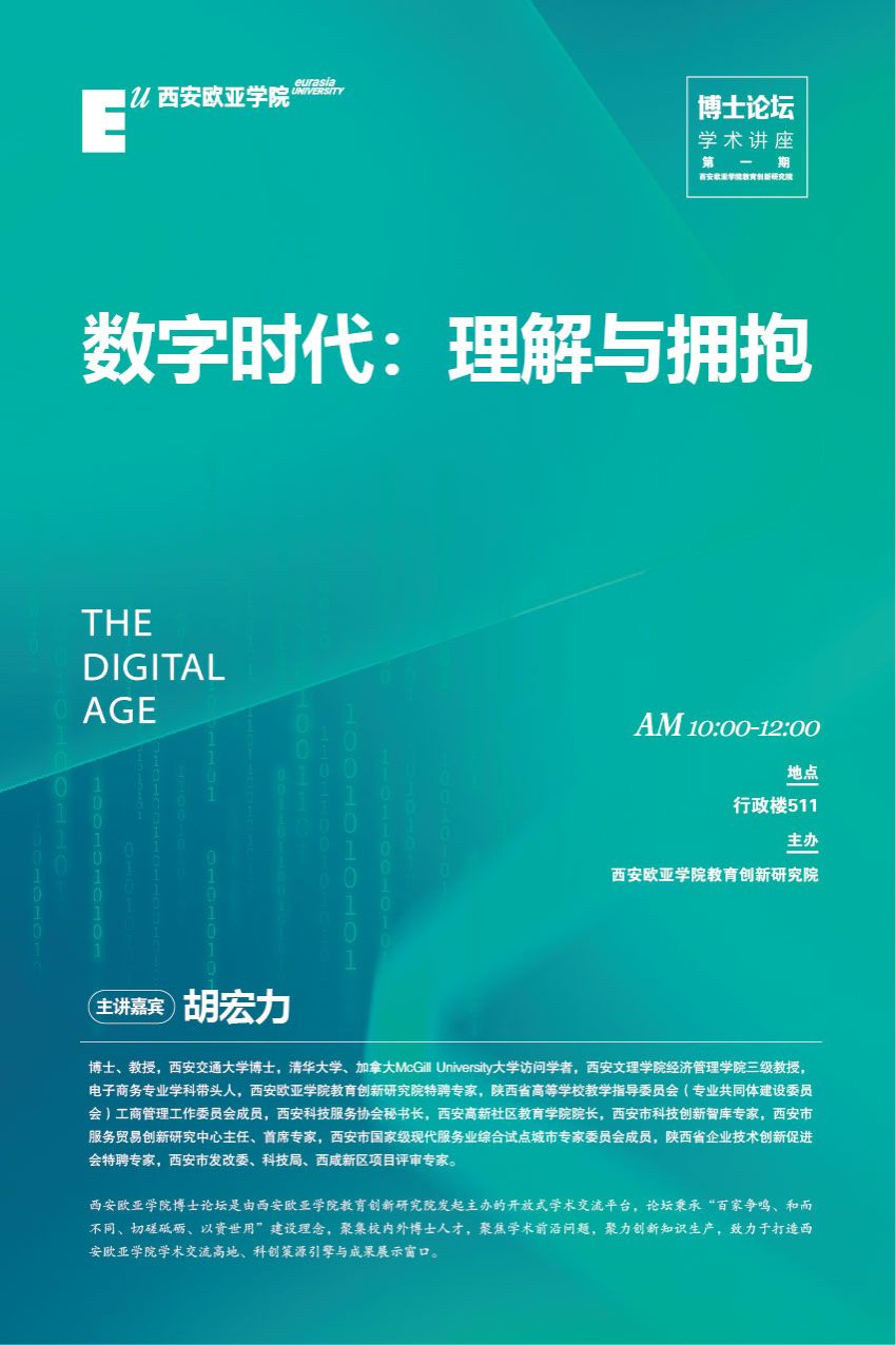 beat365正版唯一官网必一博士论坛首期学术讲座将于2023年5月10日上午10:00在行政楼511举办。讲座邀请西安文理学院三级教授、beat365正版唯一官网必一教育创新研究院特聘专家、西安高新社区教育学院院长胡宏力博士,以《数字时代:理解与拥抱》为题,围绕社会历史演进视野下的数字时代特征及影响、数字时代国家政策导向与学术研究动向解读、高校师生如何应对以及拥抱数字时代等重点内容进行知识分享和学术交流。
