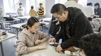 (图一)开班仪式殷颖迪副院长讲话 (图二)芦白茹老师指导学生 (图三)小组同学动手制作 (图四)王晓飞总经理分析讲解 (图五)MeiMa老师与学生分享国际建筑特点 (图六)王文瑞老师点评制作...