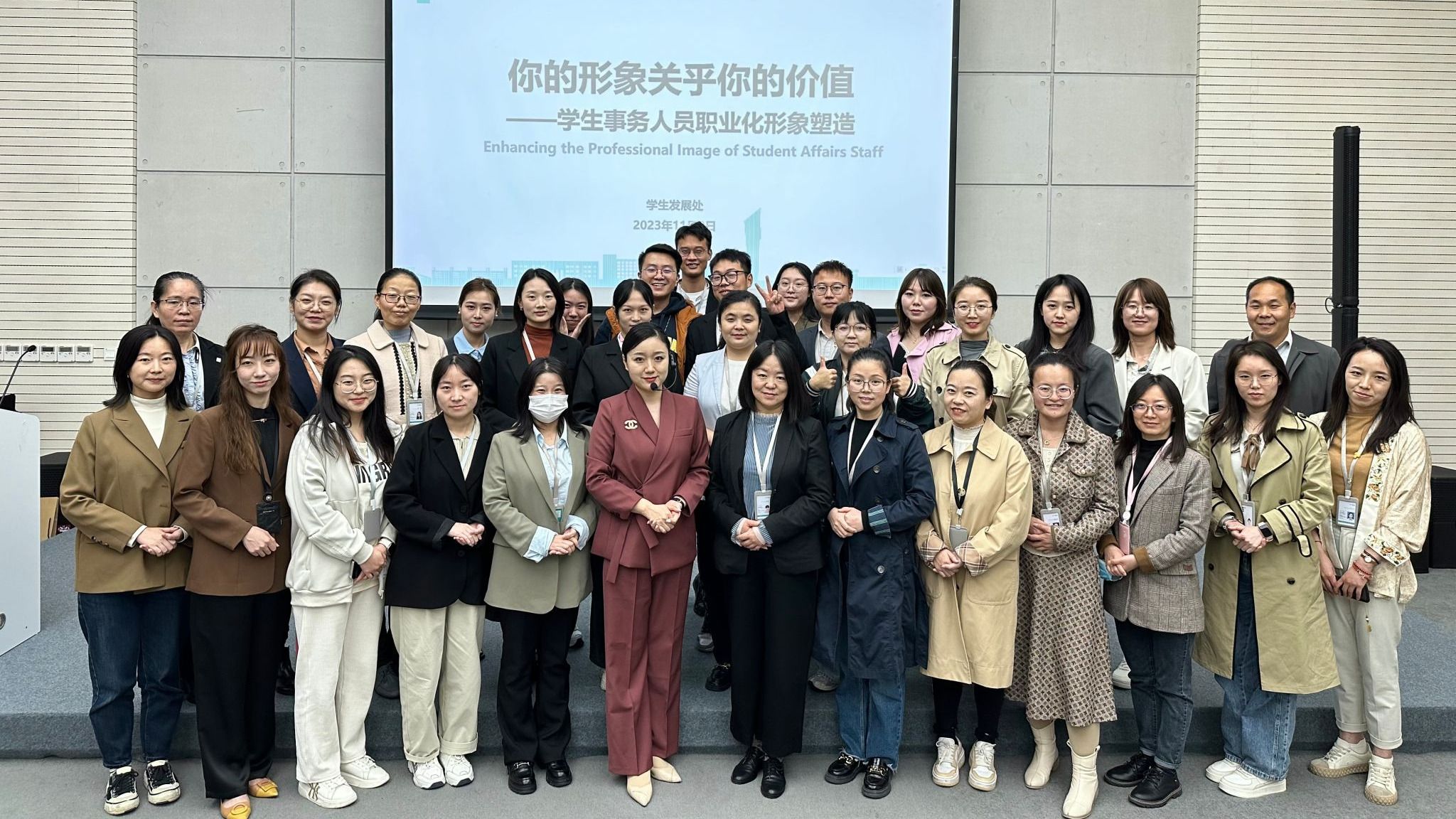为不断加强学生事务人员职业素养,展现学生事务人员职业良好精神风貌,促进学生事务人员专业化、职业化发展,提升育人质量,促进学生成长成才,11月2日上午,学生发展处在大学生活动中心组织开展了《你的形象关乎你的价值—学生事务人员职业化形象塑造》专题培训,邀请国际服务效能导师、ACI职业形象导师杨燕琪担任主讲人。学生事务部门代表共42人参加培训。(图一)学生事务人员职业化形象塑造培训合影学生发展处处长董杨作开场致辞。...
