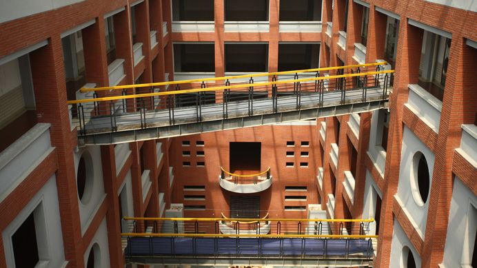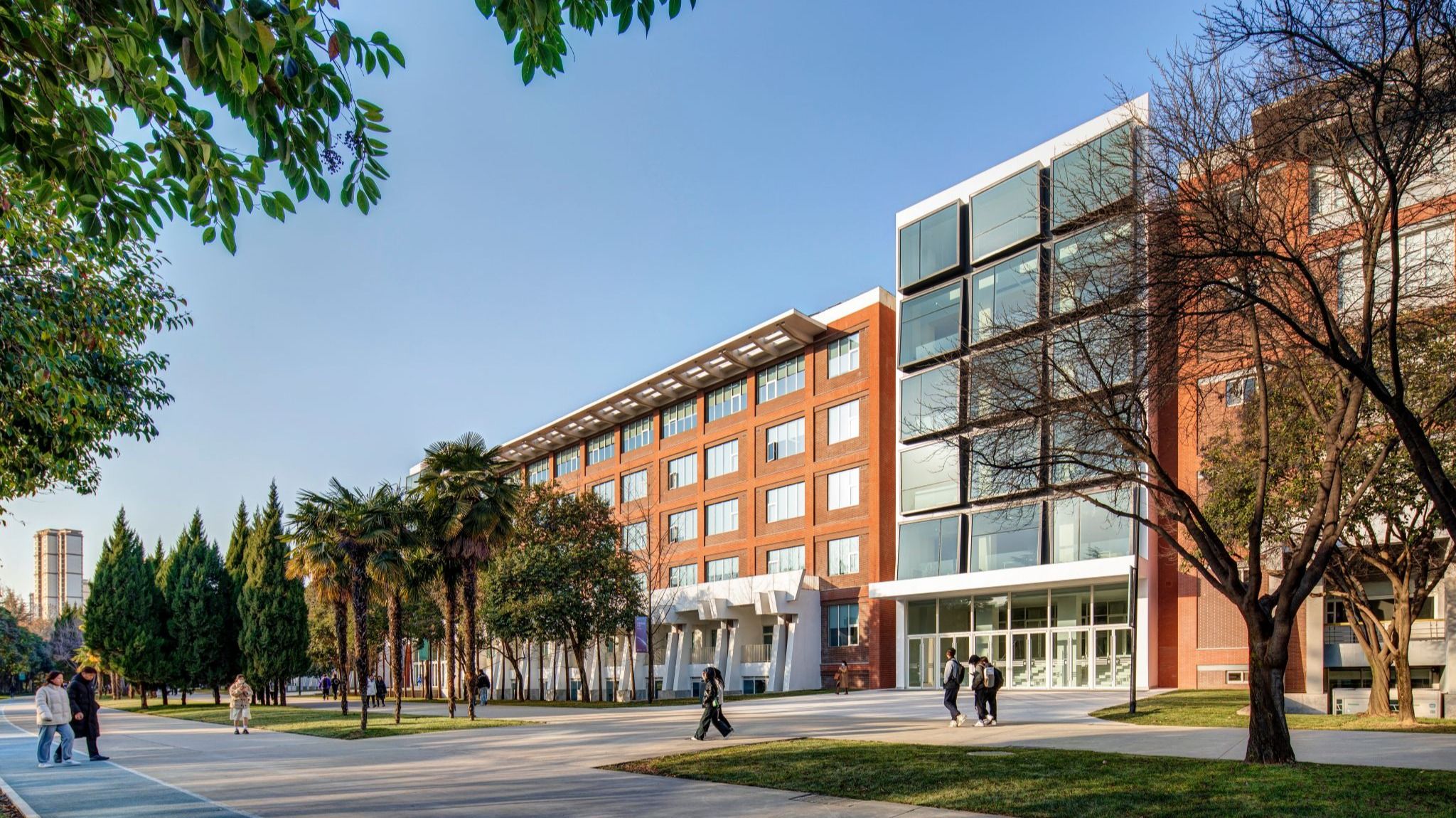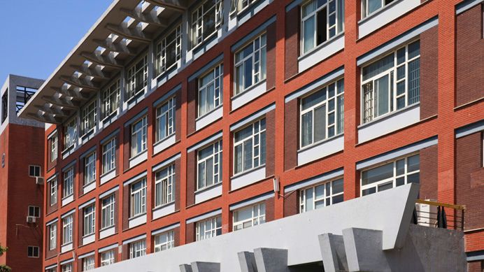 南区教学楼位于行政中心西侧,与北侧的联体教学楼共同围合起欧亚的核心公共空间。其外立面用红色面砖与白色涂料,辅以灰色面砖和玻璃材质,形成具有立体构成意味的建筑风格。在空间上,采用了模数化的开窗设计,在红、白、灰体块的开窗方式各具变化的同时,又使各部分统一为一个有机的整体。楼宇整体呈回字形,采用首尾相连的合院式布局组织起艾德艺术设计学院、文化传媒学院、数据科学学院和会计金融学院四大分院的教学楼群。