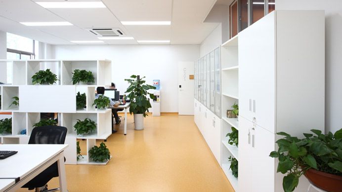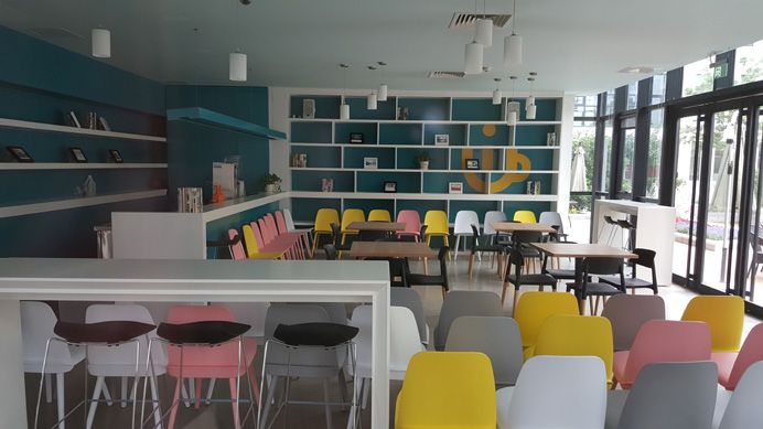 教学楼建筑群的四个分院拥有各自独立的入口及接待处,并采用不同的标识和墙体颜色作区分。结合每个分院独特的理念和精神,设计师stéphane ROUX赋予了建筑不同的主题。艾德艺术设计学院是接近大地的赭色,纯朴又不乏创造感;数据科学科学院是活泼的黄色;会计金融学院是沉稳的蓝色;文化传媒学院则是跃动的水蓝色,这种差异使得整体的室外环境显得更加丰富。看似是完全不同的四个小世界,却由回廊相通并连接,实现了分院间的资源共享和联合,包括课程之间的学术交流、与不同背景的学生彼此观念上的吸收等,激发创造力。